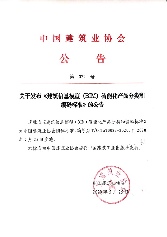 關(guān)于發(fā)布《建筑信息模型(BIM)智能化產(chǎn)品分類和編碼標(biāo)準(zhǔn)》的公告