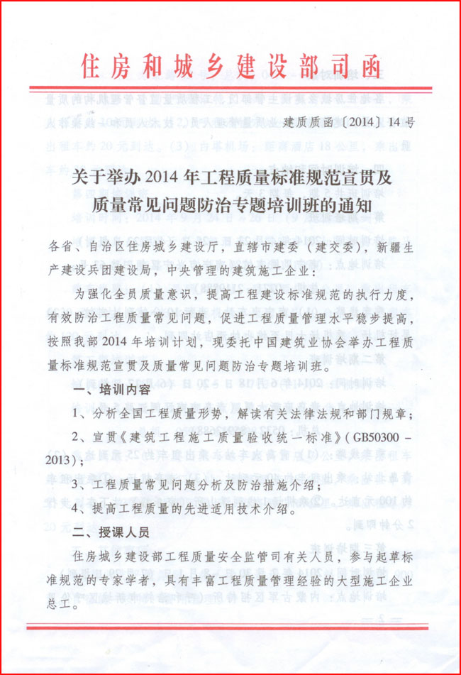 附件:關于舉辦2014年工程質量標準規范宣貫及質量常見問題防治專題培訓班的通知