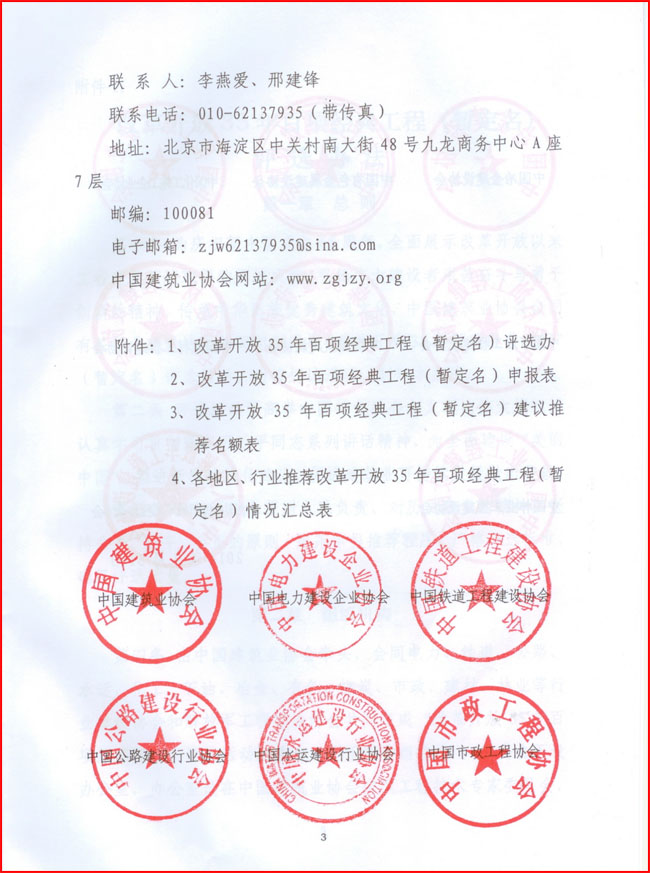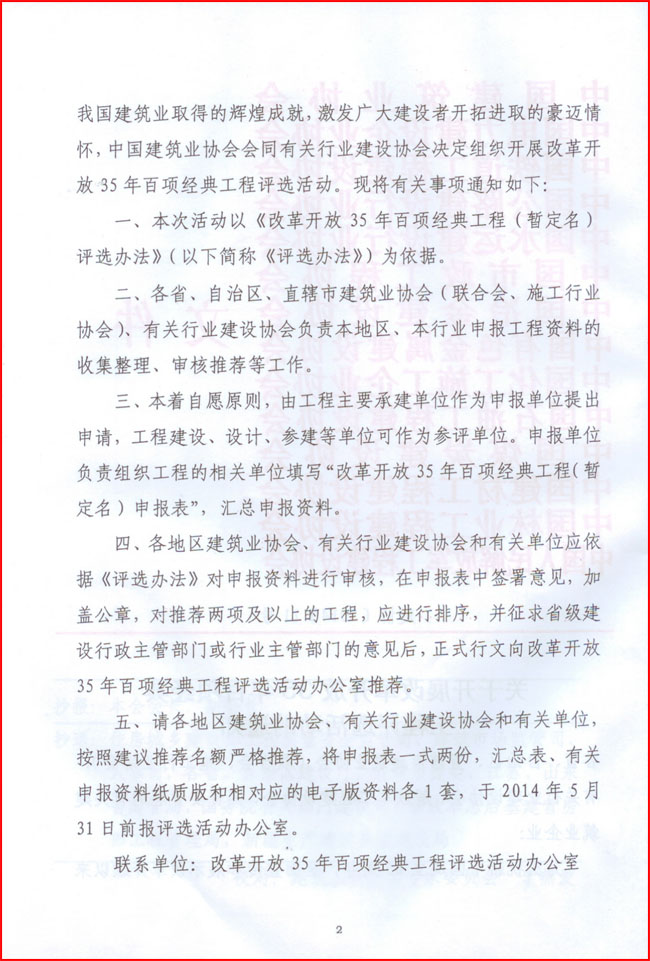 第四條 由中國建筑業協會牽頭,會同電力、鐵道、公路、水運、化工、石油、冶金、有色、煤炭、市政、建材、林業等行業建設協會和解放軍工程建設協會共同組成“改革開放35年百項經典工程”評選活動組委會(以下簡稱組委會)。組委會下設辦公室,辦公室設在中國建筑業協會建筑工程技術專家委員會,負責具體事務工作。
