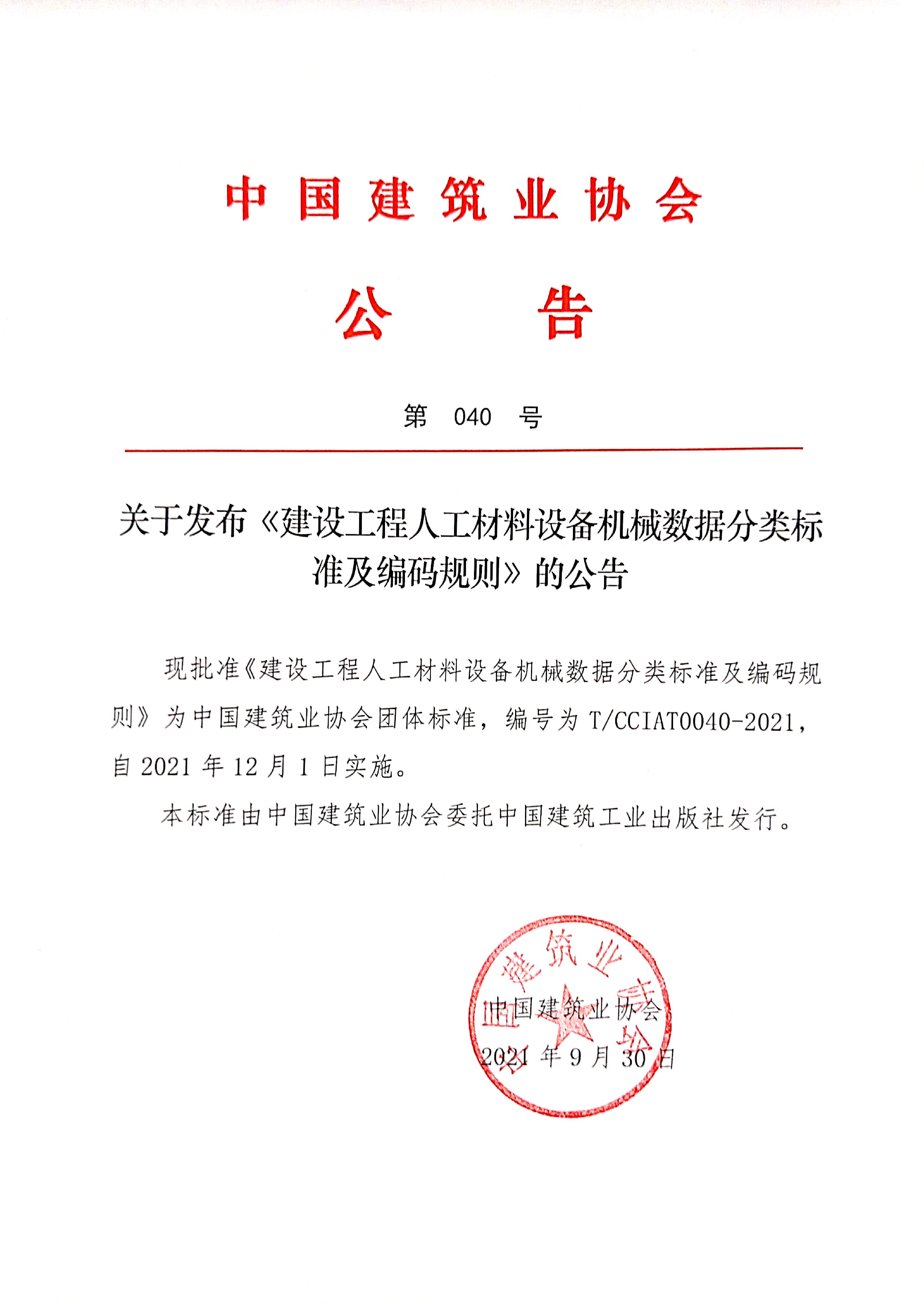 關(guān)于發(fā)布《建設(shè)工程人工材料設(shè)備機(jī)械數(shù)據(jù)分類標(biāo)準(zhǔn)及編碼規(guī)則》的公告