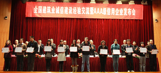 1月17日,中國(guó)建筑業(yè)協(xié)會(huì)在京召開建筑業(yè)企業(yè)誠(chéng)信建設(shè)經(jīng)驗(yàn)交流暨第二批建筑業(yè)AAA級(jí)信用企業(yè)發(fā)布會(huì)。北京城建集團(tuán)有限責(zé)任公司等114家建筑業(yè)企業(yè)榮獲2010年度“全國(guó)建筑業(yè)AAA級(jí)信用企業(yè)”稱號(hào)。