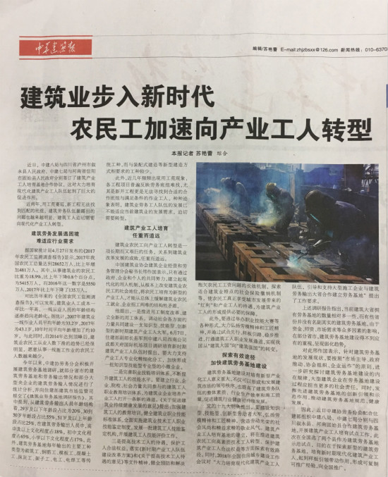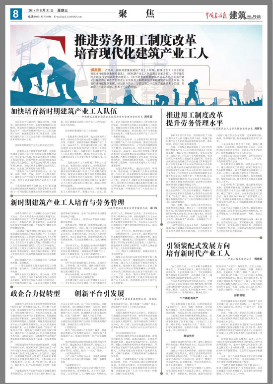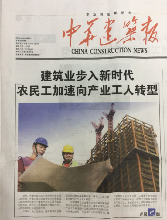 日前,《中國建設報》建筑半月談8月31日專版聚焦“推進建筑勞務用工制度改革,培育現(xiàn)代化建筑產(chǎn)業(yè)工人”。在頭條位置刊登了我會副會長兼秘書長邢作國的文章《加快培育新時期建筑產(chǎn)業(yè)工人隊伍》,以及我會理事唐新球等同志的文章《政企合力促轉型創(chuàng)新平臺引發(fā)展》。《中華建筑報》8月28日以《建筑業(yè)步入新時代 農(nóng)民工加速向建筑產(chǎn)業(yè)工人轉型》為題在頭版頭條和第二版顯要位置刊登了采訪我會負責人的專題報道。
