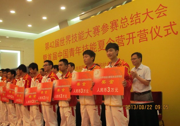 人力資源和社會保障部部長尹蔚民等領導出席并為獲獎選手和專家教練團隊頒獎。中國建筑業協會建筑企業經營和勞務管理分會負責選拔、組織集訓的瓷磚貼面項目選手、第42屆世界技能大賽優勝獎牌獲得者高艷濤,受到通報表揚,晉升技師職業資格,并將于2014年授予“全國技術能手”榮譽稱號。